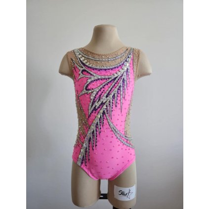 Nový trikot na moderní gymnastiku, je bohatě zdobený a velmi krásný. Rozměry: od ramene do rozkroku 57cm, prsa 34cm, pas 28cm, boky 32cm.